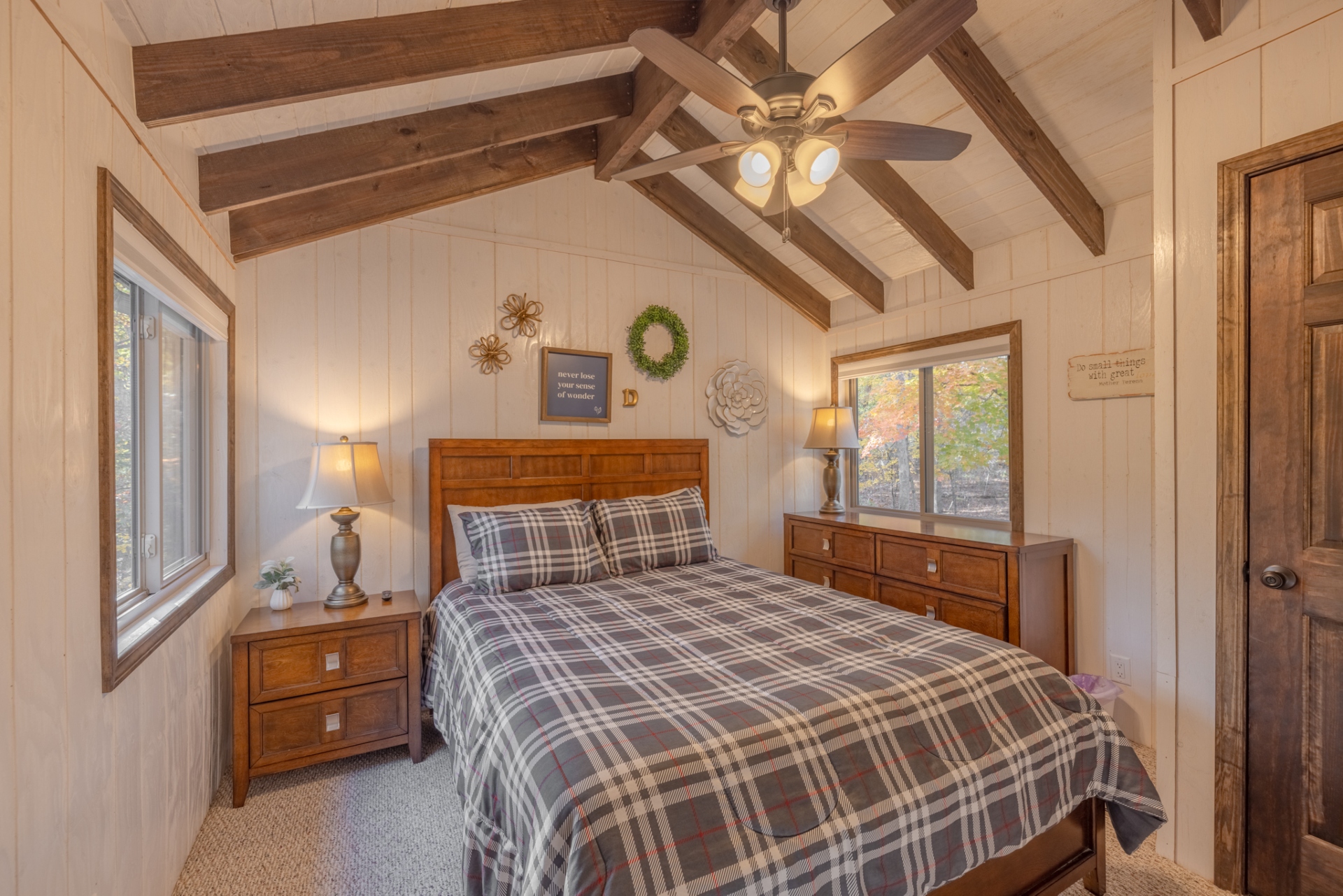 Inside, you’ll find an open floorplan with plenty of comfortable living room seating, smart TV, ceiling fan, floor to ceiling windows, and access to our oversized deck. The full kitchen includes all you need to prepare meals and snacks, and a dining table at which to enjoy them.